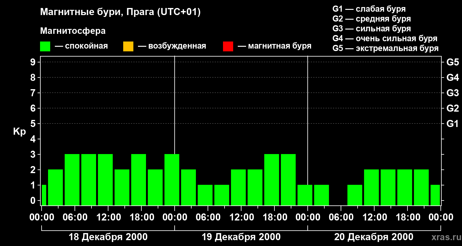 Изменения геомагнитного индекса Kp с 18 по 20 декабря 2000 года для средних широт
