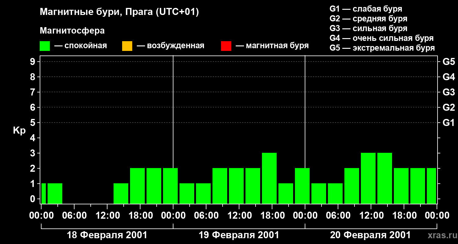 Изменения геомагнитного индекса Kp с 18 по 20 февраля 2001 года для средних широт