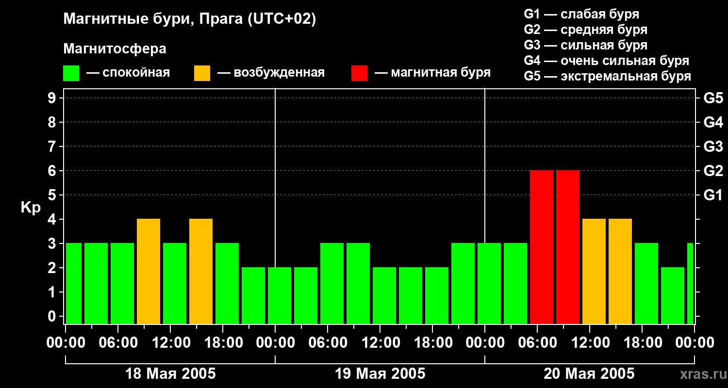 Изменения геомагнитного индекса Kp с 18 по 20 мая 2005 года для средних широт