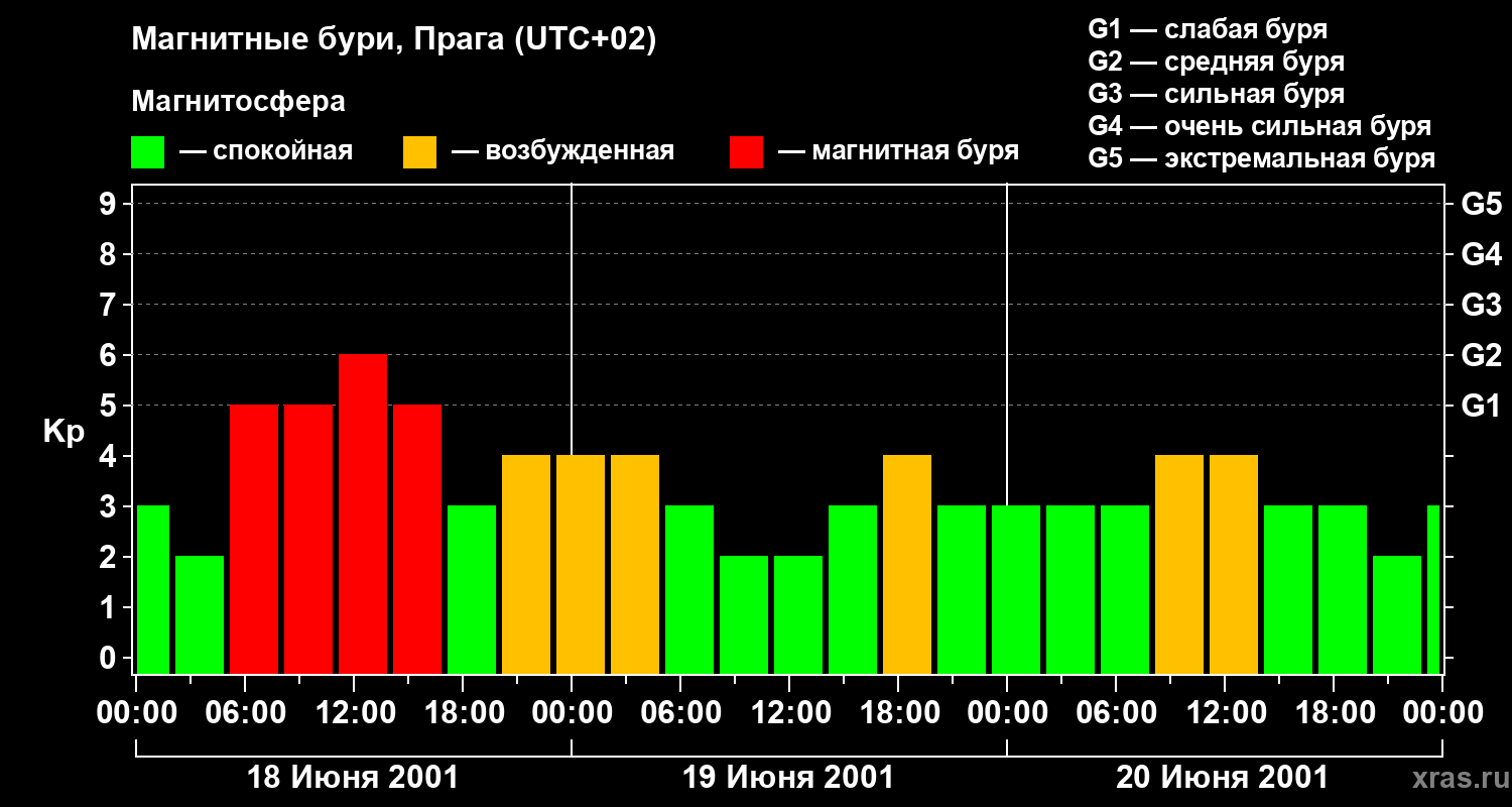 Изменения геомагнитного индекса Kp с 18 по 20 июня 2001 года для средних широт