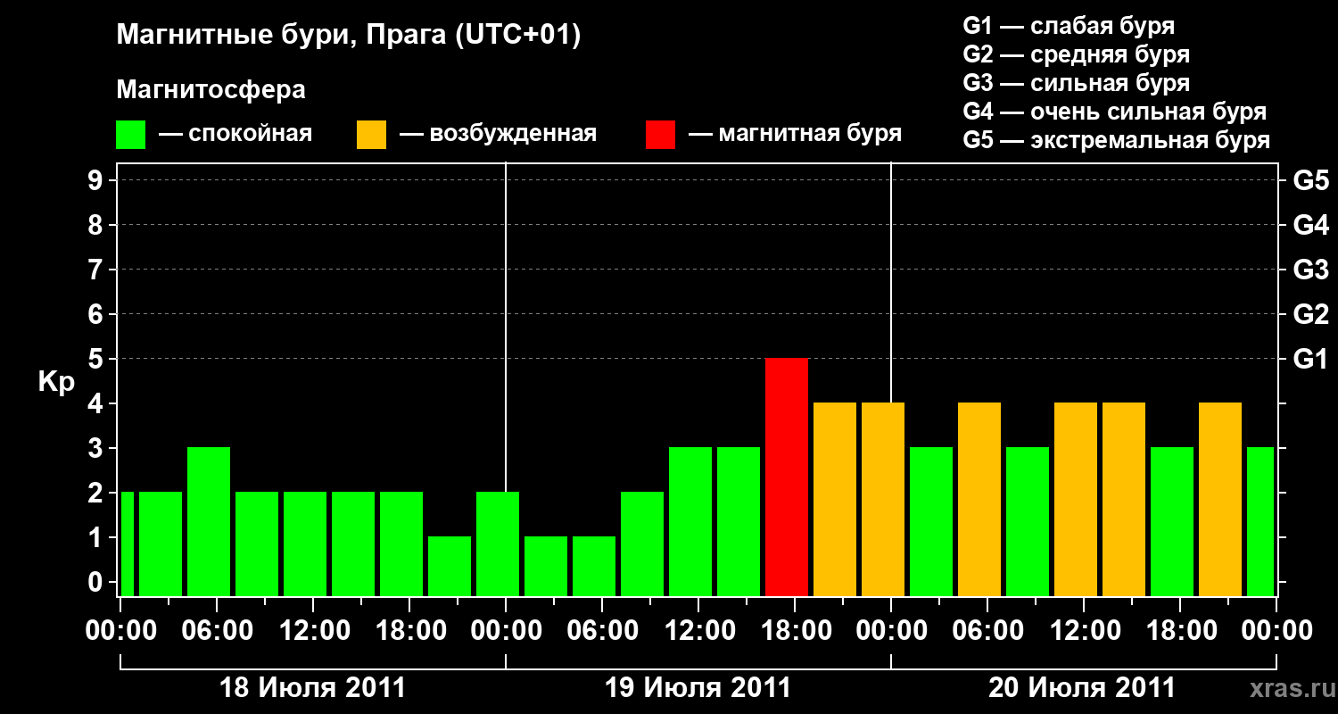 Изменения геомагнитного индекса Kp с 18 по 20 июля 2011 года для средних широт