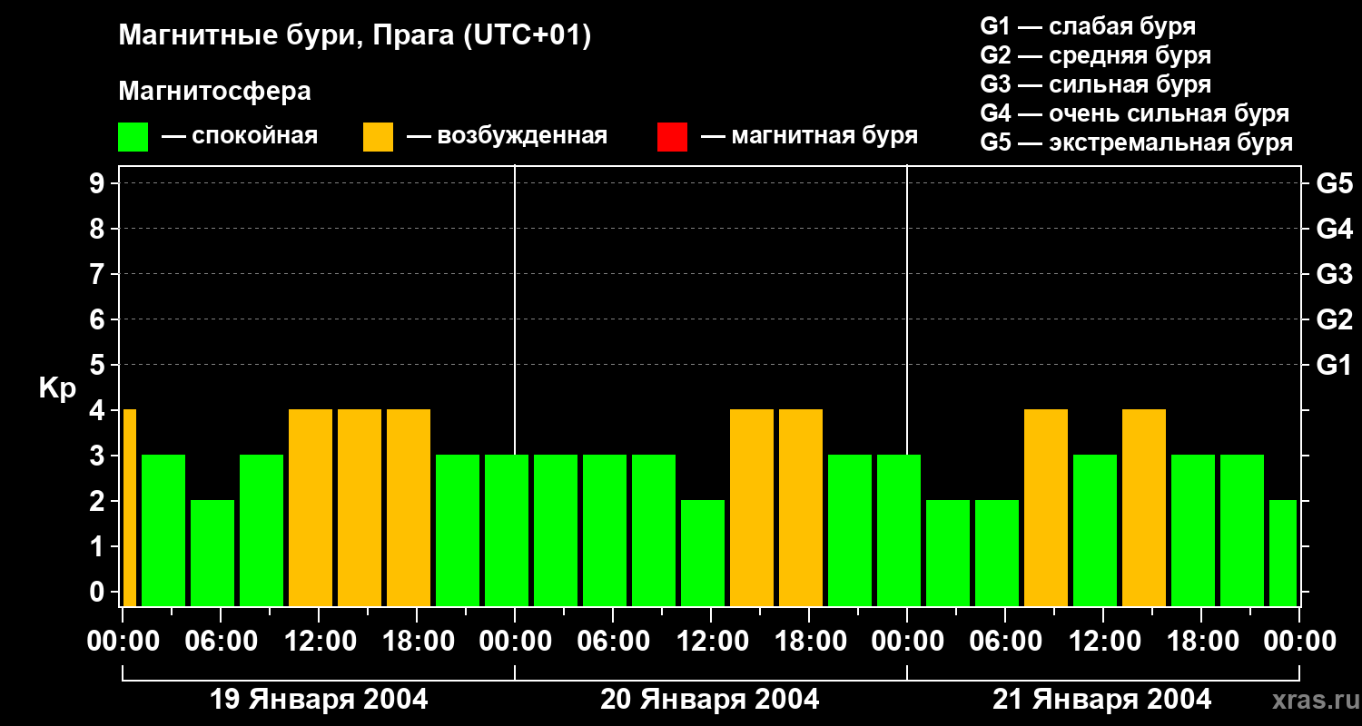 Изменения геомагнитного индекса Kp с 19 по 21 января 2004 года для средних широт