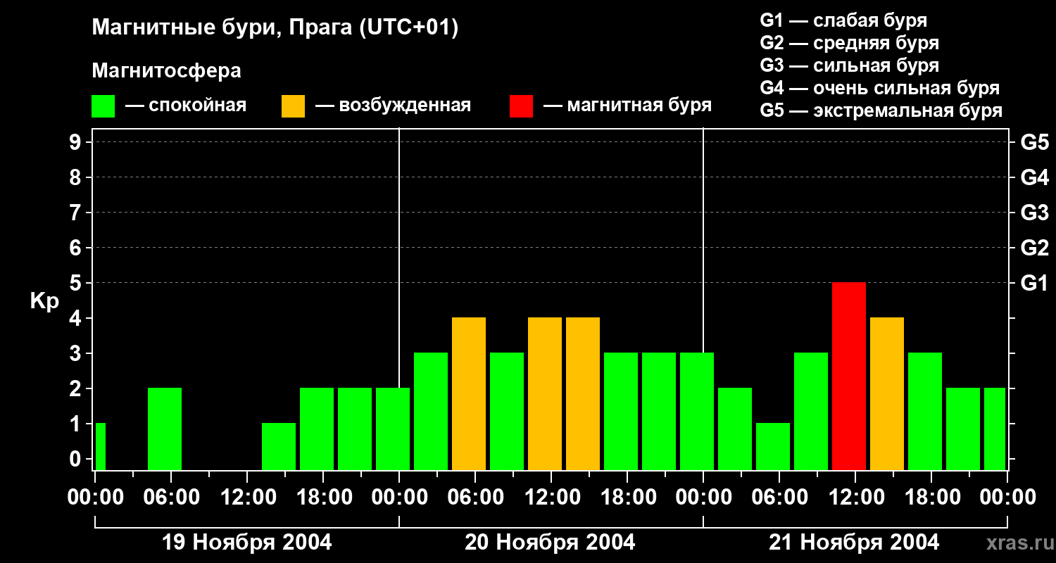 Изменения геомагнитного индекса Kp с 19 по 21 ноября 2004 года для средних широт