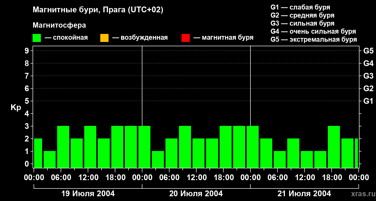Изменения геомагнитного индекса Kp с 19 по 21 июля 2004 года для средних широт