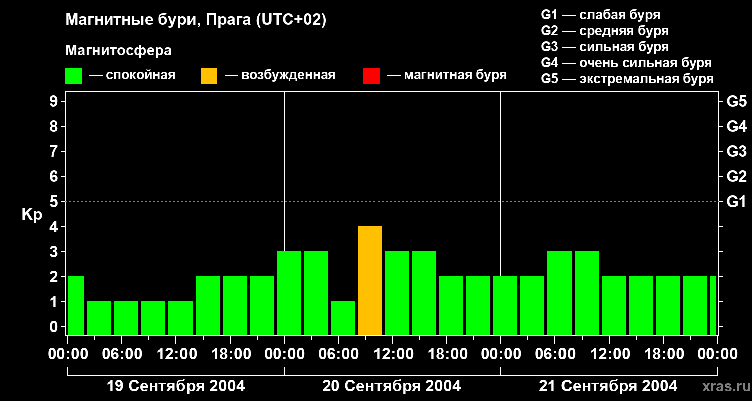 Изменения геомагнитного индекса Kp с 19 по 21 сентября 2004 года для средних широт