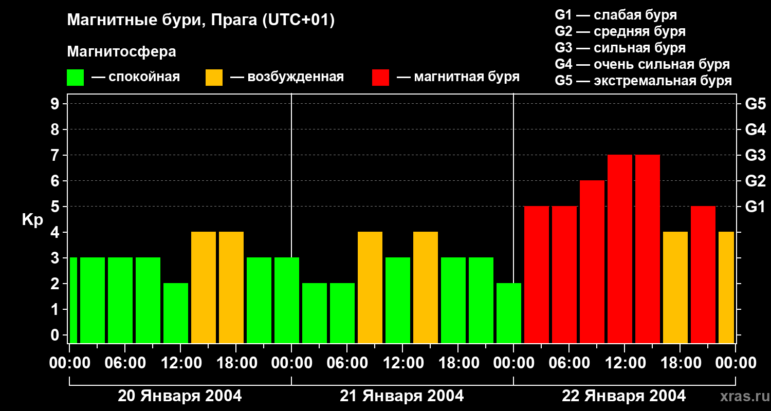 Изменения геомагнитного индекса Kp с 20 по 22 января 2004 года для средних широт