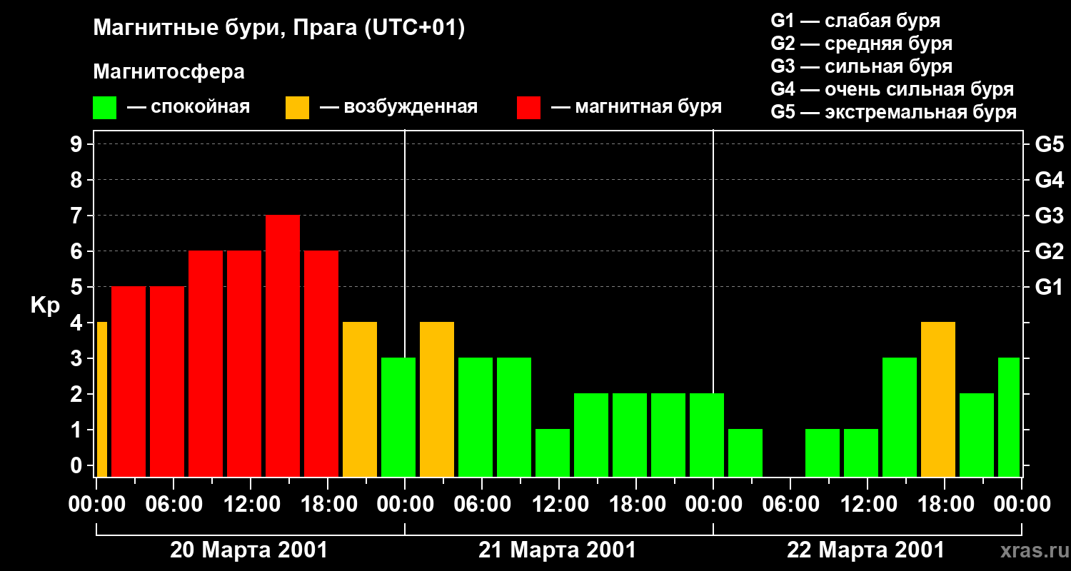 Изменения геомагнитного индекса Kp с 20 по 22 марта 2001 года для средних широт