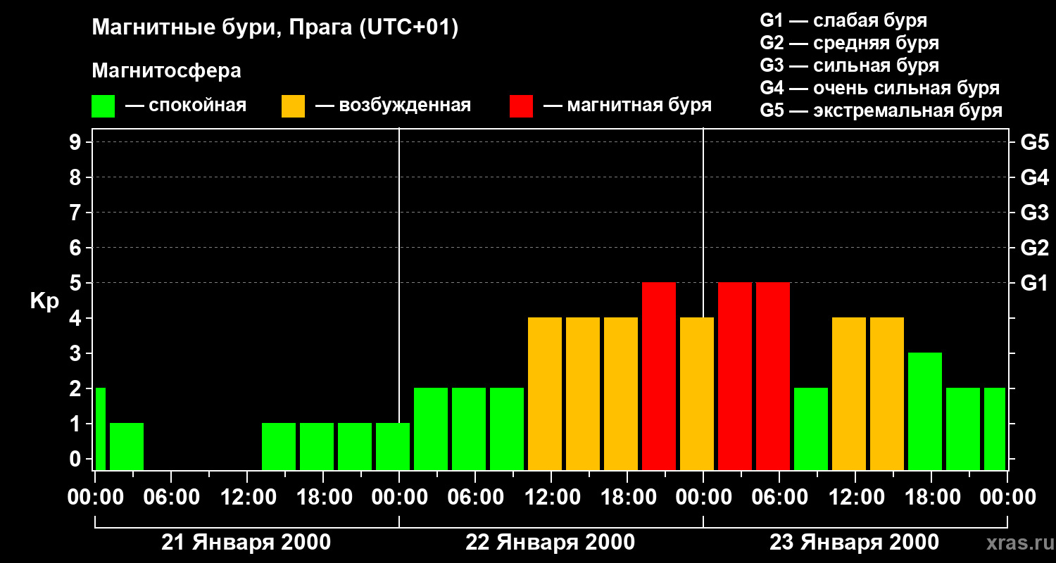 Изменения геомагнитного индекса Kp с 21 по 23 января 2000 года для средних широт