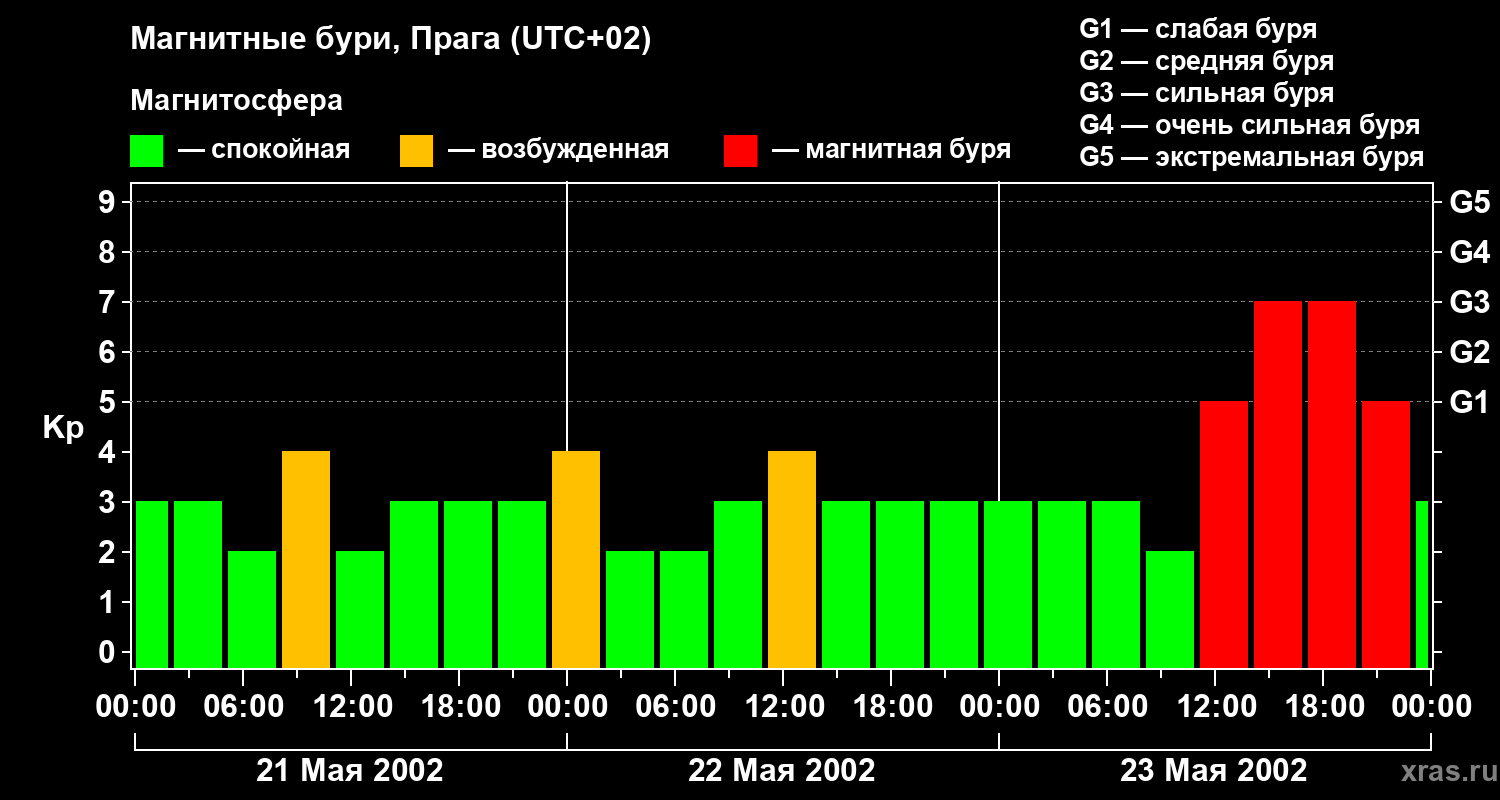 Изменения геомагнитного индекса Kp с 21 по 23 мая 2002 года для средних широт