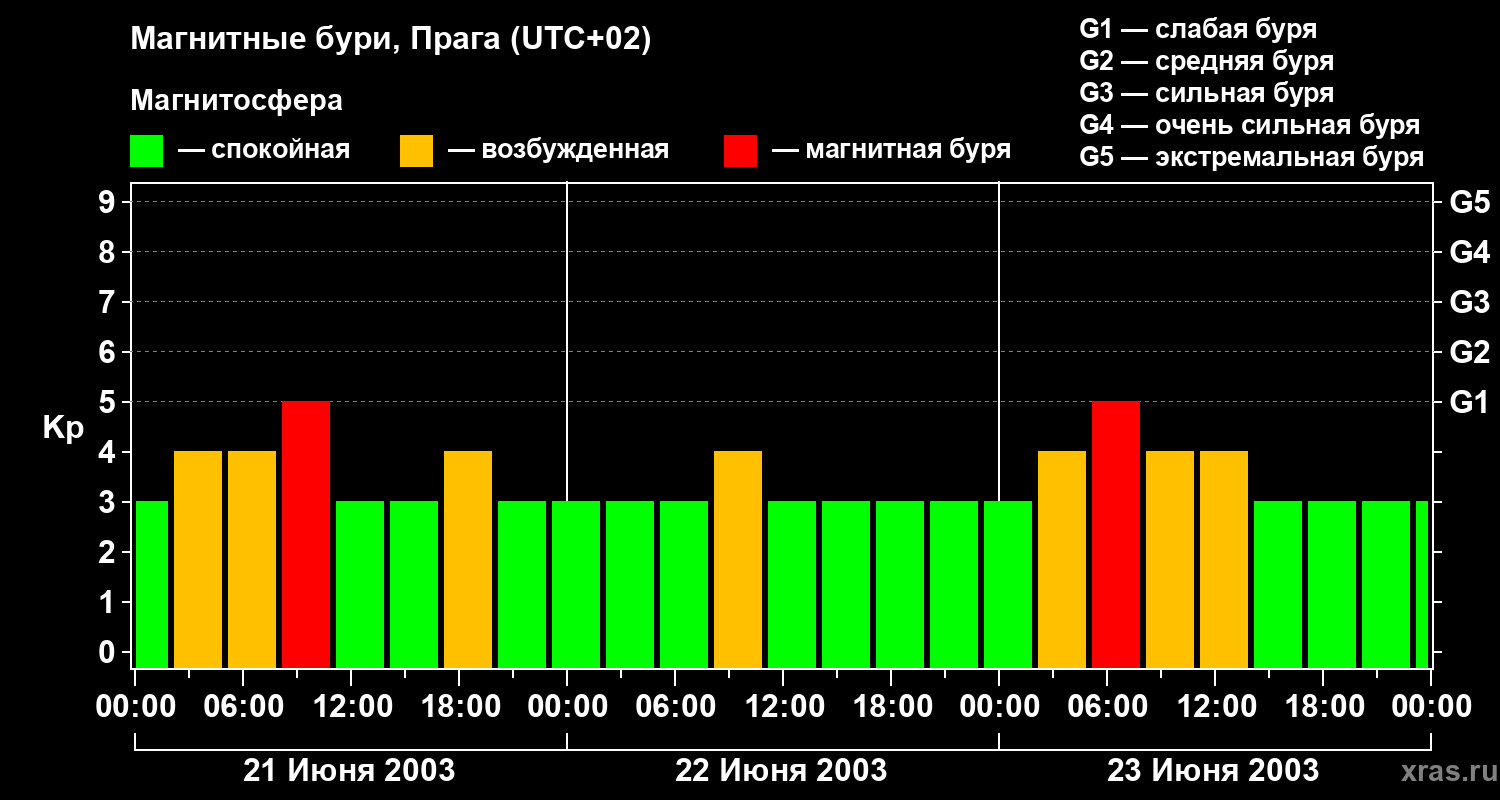 Изменения геомагнитного индекса Kp с 21 по 23 июня 2003 года для средних широт
