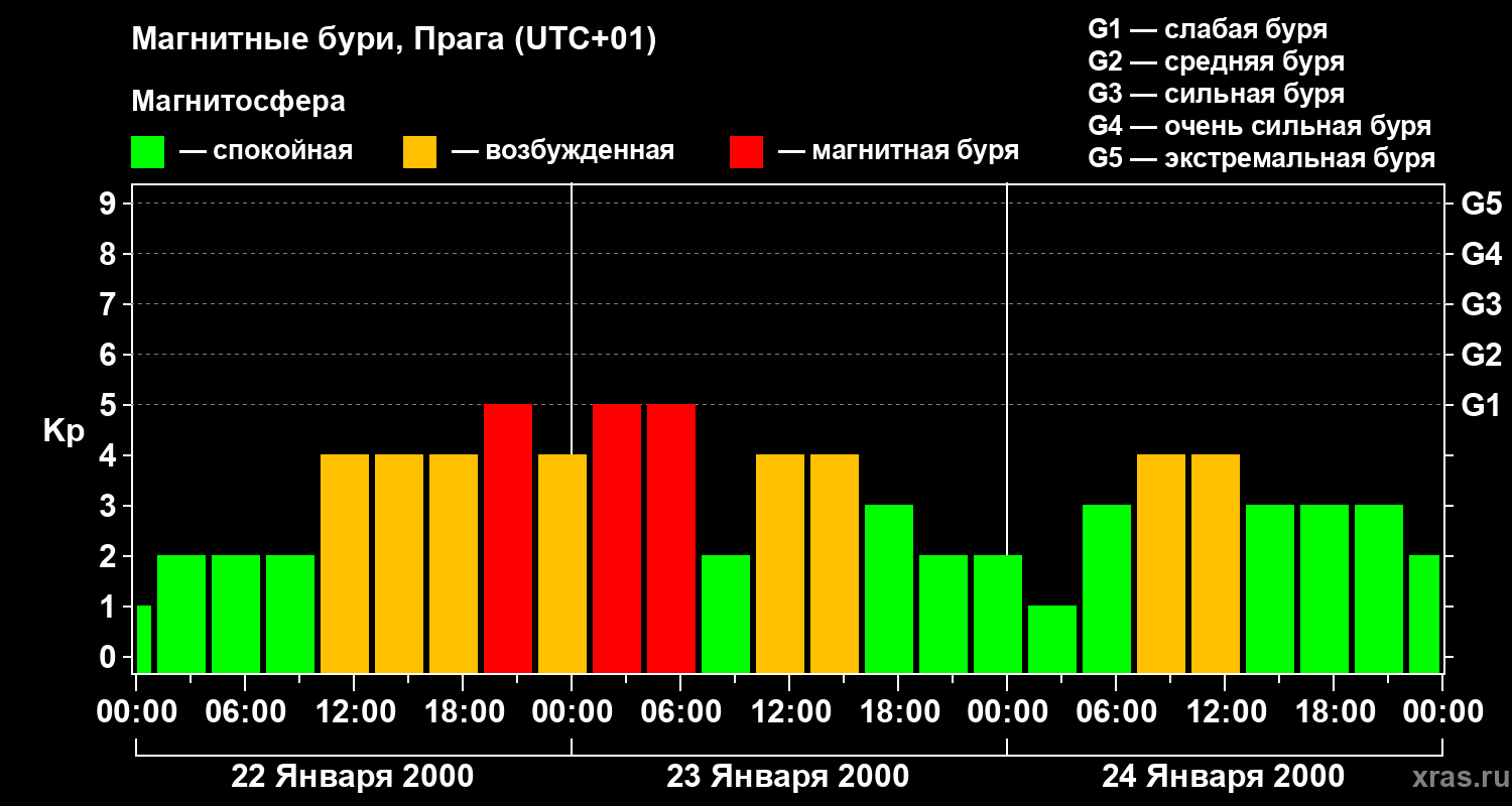 Изменения геомагнитного индекса Kp с 22 по 24 января 2000 года для средних широт