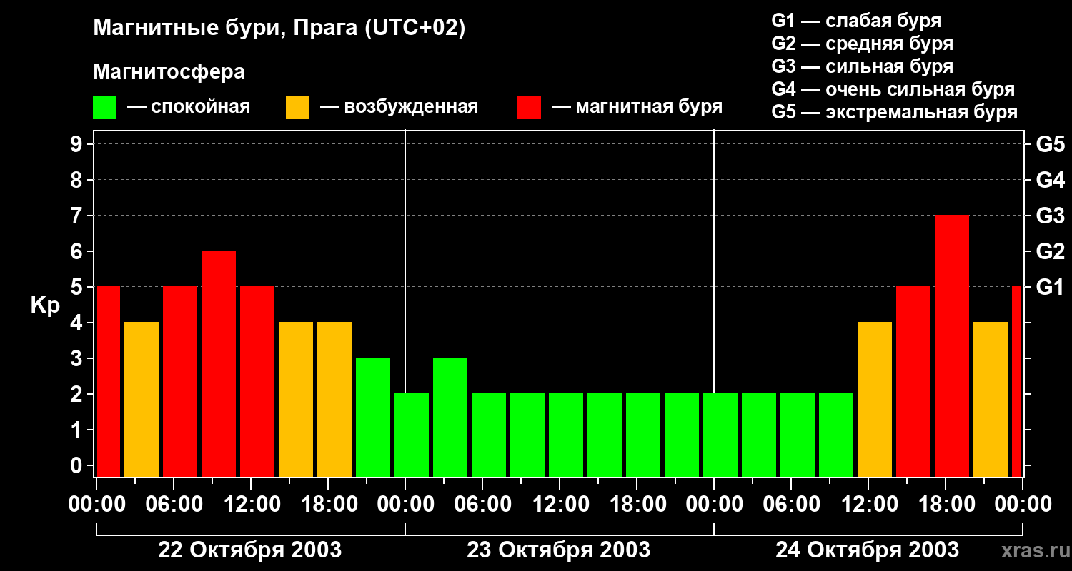 Изменения геомагнитного индекса Kp с 22 по 24 октября 2003 года для средних широт