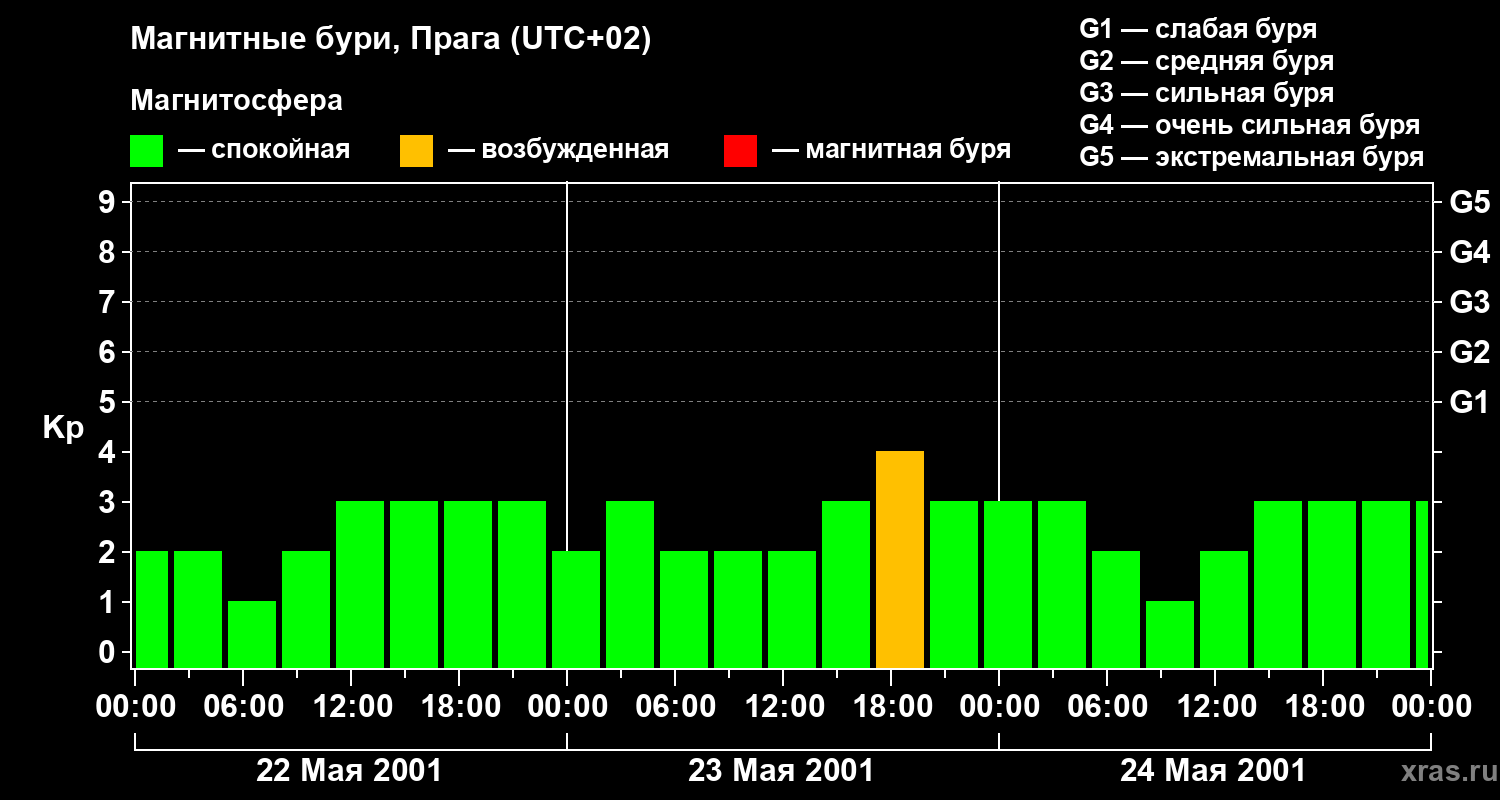 Изменения геомагнитного индекса Kp с 22 по 24 мая 2001 года для средних широт