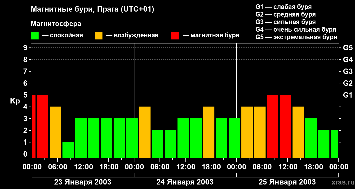 Изменения геомагнитного индекса Kp с 23 по 25 января 2003 года для средних широт