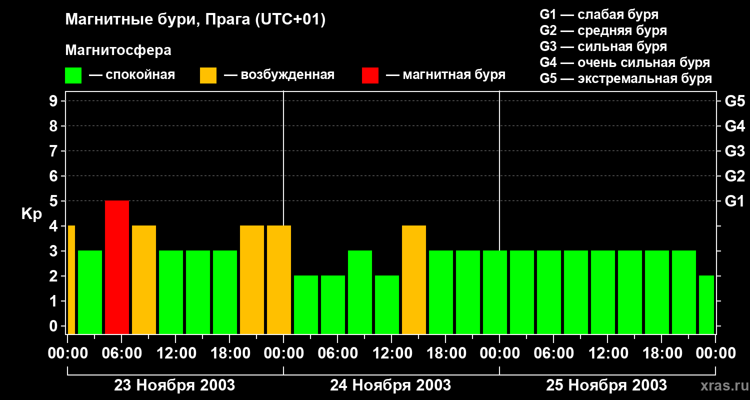 Изменения геомагнитного индекса Kp с 23 по 25 ноября 2003 года для средних широт