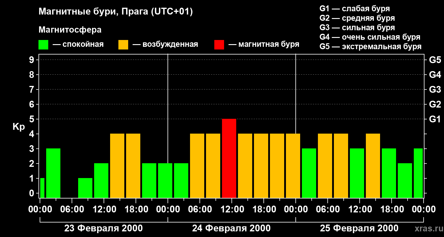 Изменения геомагнитного индекса Kp с 23 по 25 февраля 2000 года для средних широт