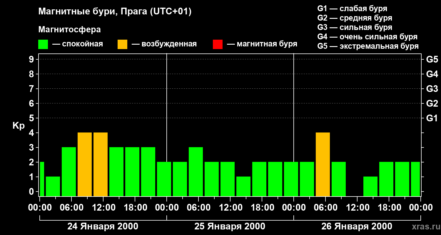 Изменения геомагнитного индекса Kp с 24 по 26 января 2000 года для средних широт