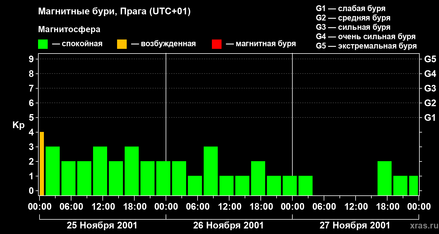 Изменения геомагнитного индекса Kp с 25 по 27 ноября 2001 года для средних широт