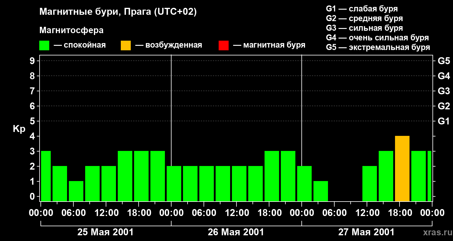 Изменения геомагнитного индекса Kp с 25 по 27 мая 2001 года для средних широт