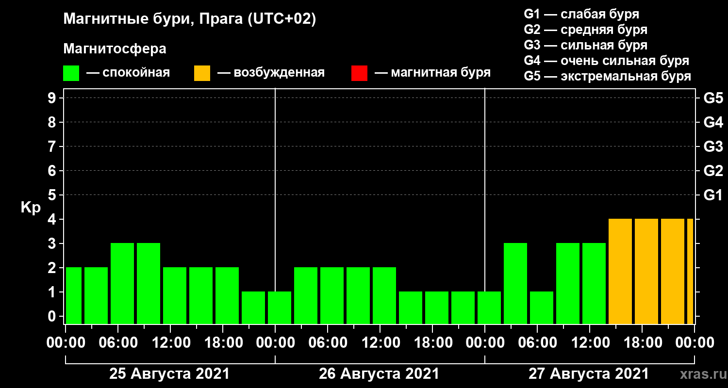 Изменения геомагнитного индекса Kp с 25 по 27 августа 2021 года для средних широт