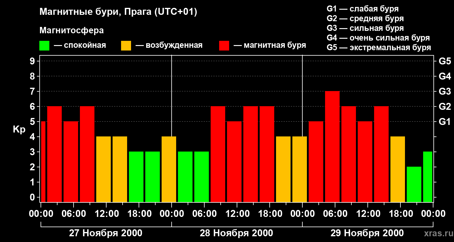 Изменения геомагнитного индекса Kp с 27 по 29 ноября 2000 года для средних широт