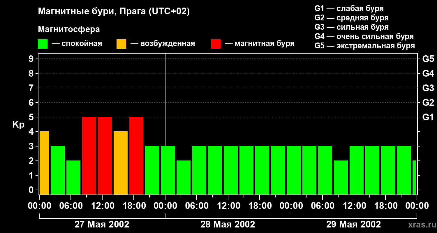 Изменения геомагнитного индекса Kp с 27 по 29 мая 2002 года для средних широт