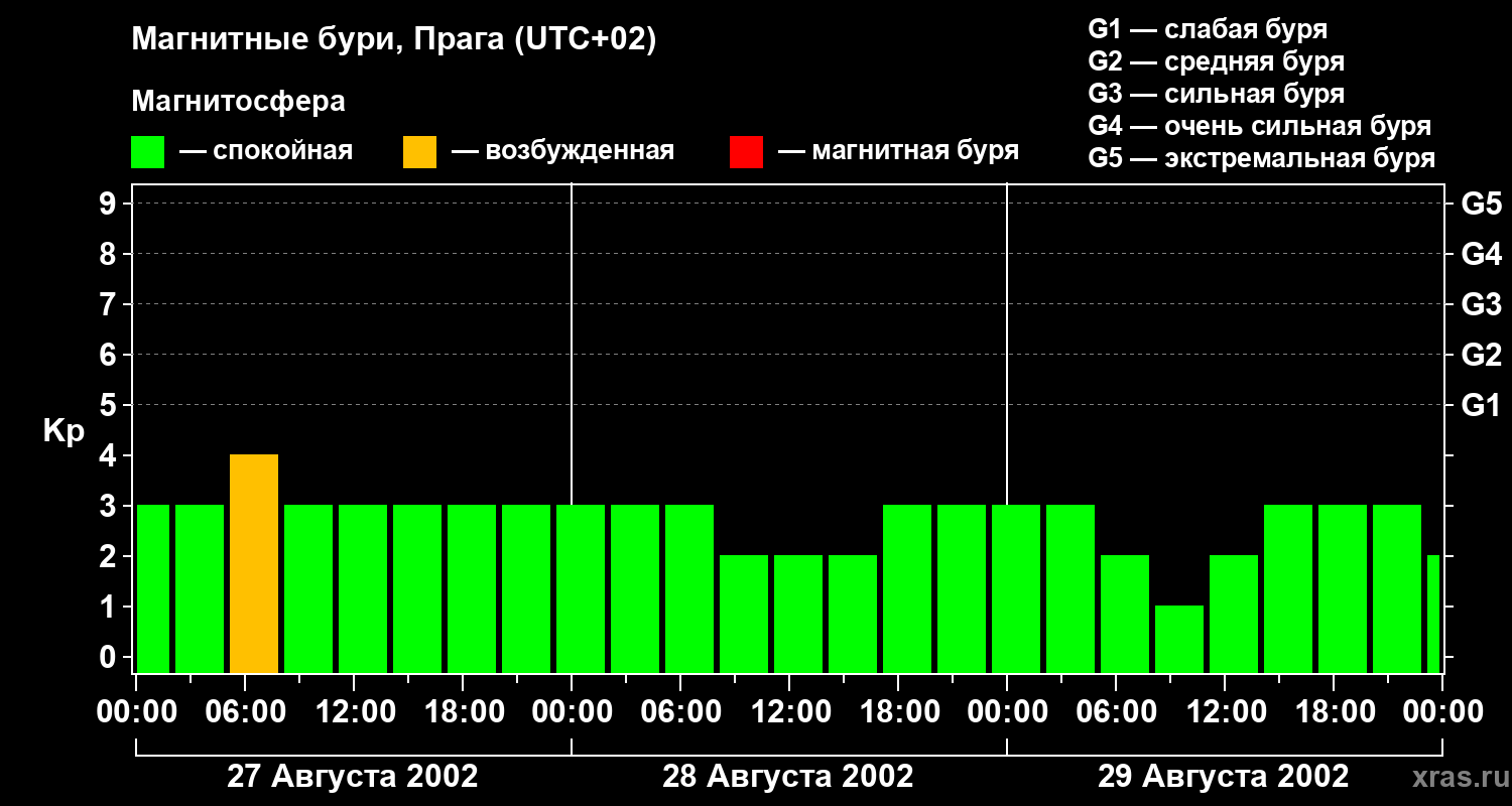 Изменения геомагнитного индекса Kp с 27 по 29 августа 2002 года для средних широт