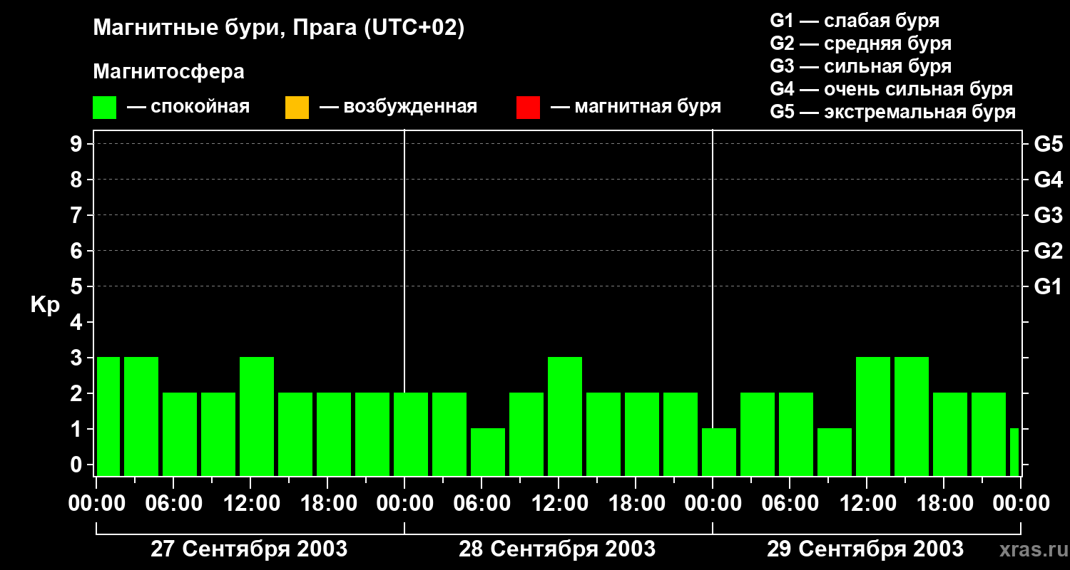 Изменения геомагнитного индекса Kp с 27 по 29 сентября 2003 года для средних широт