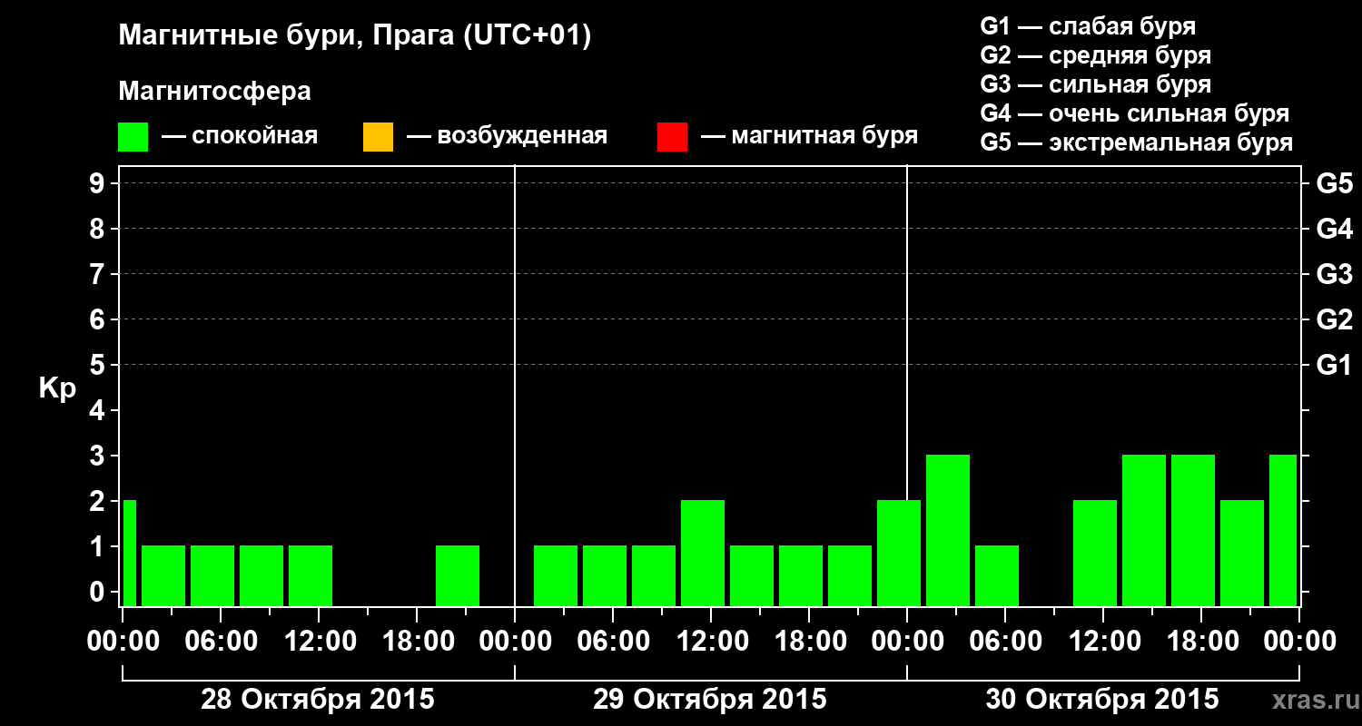 Изменения геомагнитного индекса Kp с 28 по 30 октября 2015 года для средних широт