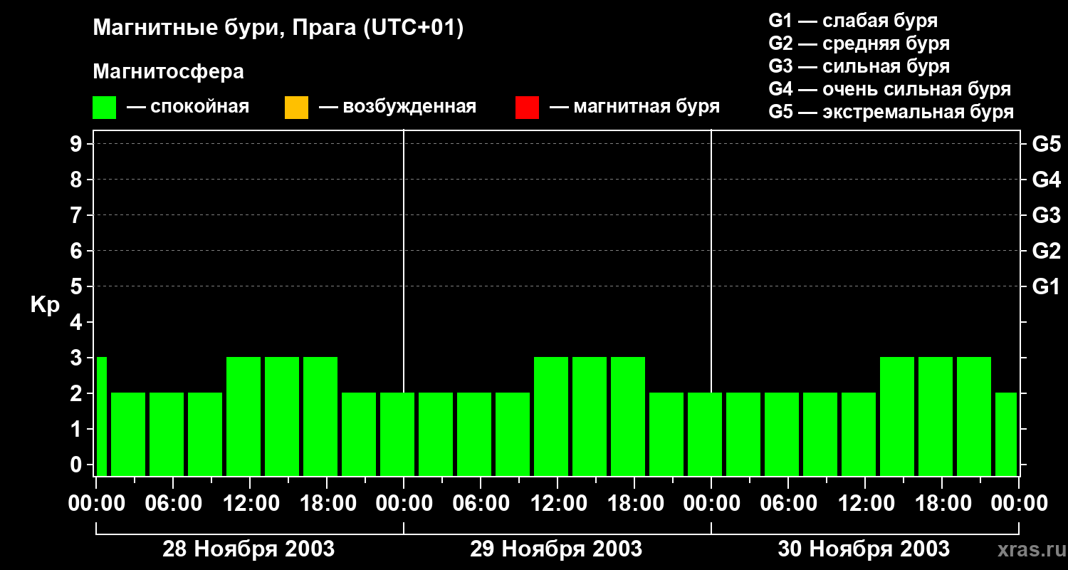 Изменения геомагнитного индекса Kp с 28 по 30 ноября 2003 года для средних широт