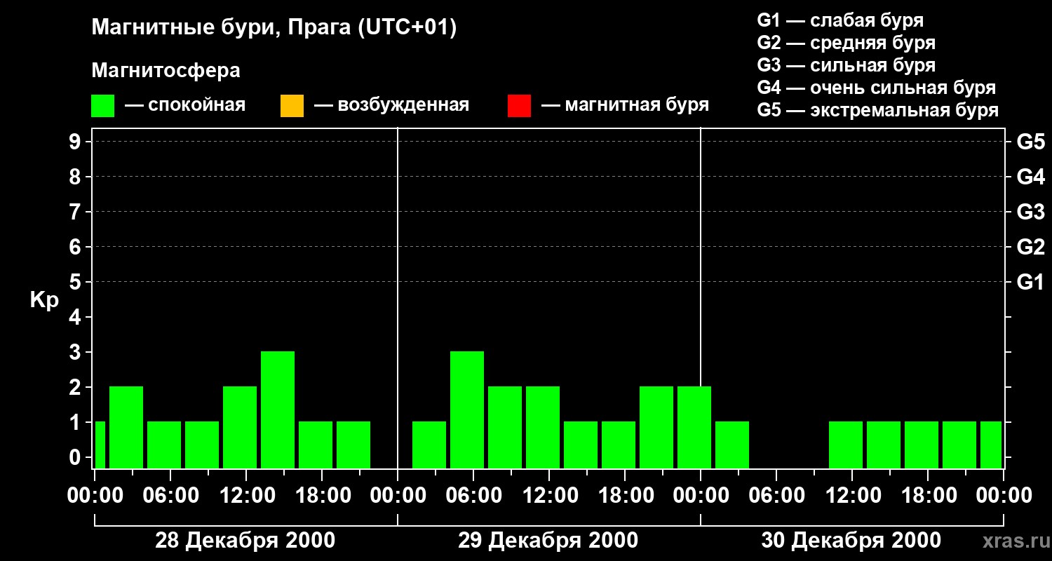 Изменения геомагнитного индекса Kp с 28 по 30 декабря 2000 года для средних широт