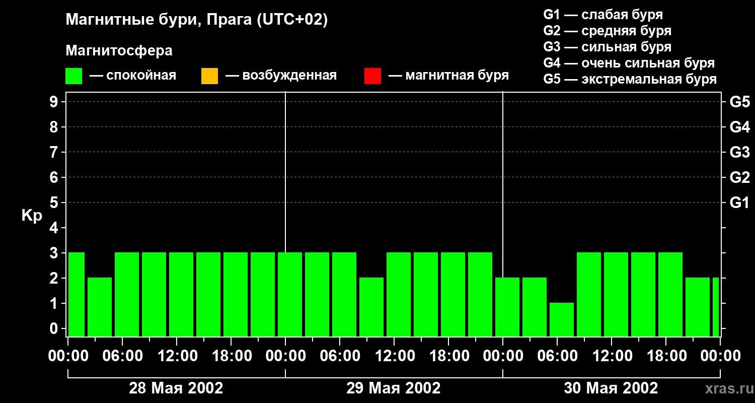 Изменения геомагнитного индекса Kp с 28 по 30 мая 2002 года для средних широт