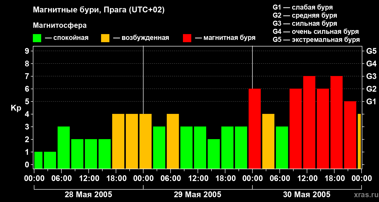 Изменения геомагнитного индекса Kp с 28 по 30 мая 2005 года для средних широт