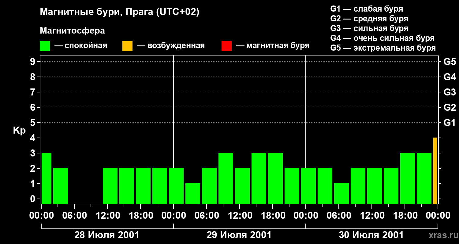 Изменения геомагнитного индекса Kp с 28 по 30 июля 2001 года для средних широт