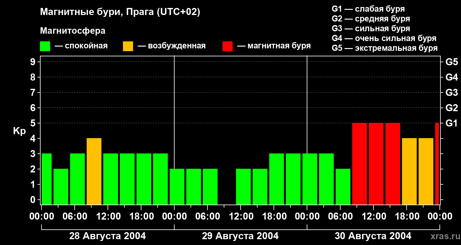Изменения геомагнитного индекса Kp с 28 по 30 августа 2004 года для средних широт