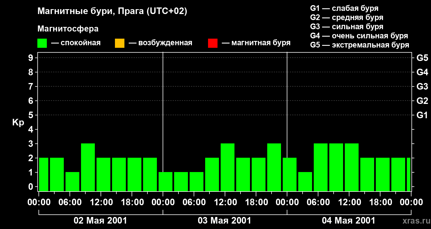 Изменения геомагнитного индекса Kp с 2 по 4 мая 2001 года для средних широт