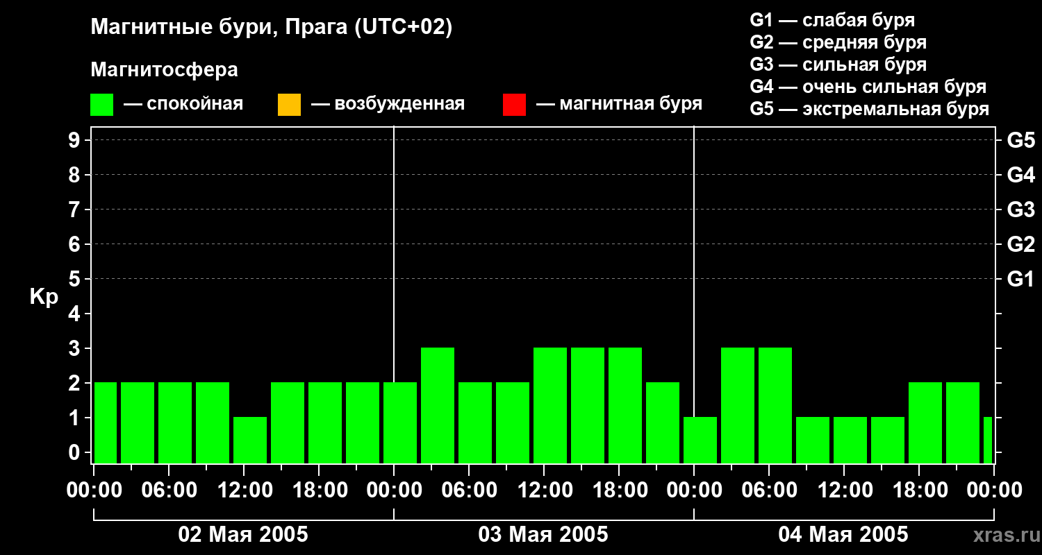 Изменения геомагнитного индекса Kp с 2 по 4 мая 2005 года для средних широт