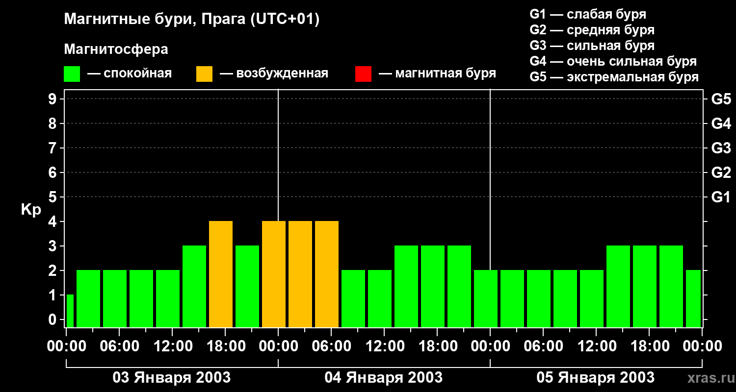 Изменения геомагнитного индекса Kp с 3 по 5 января 2003 года для средних широт