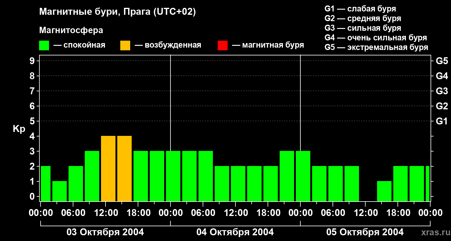 Изменения геомагнитного индекса Kp с 3 по 5 октября 2004 года для средних широт