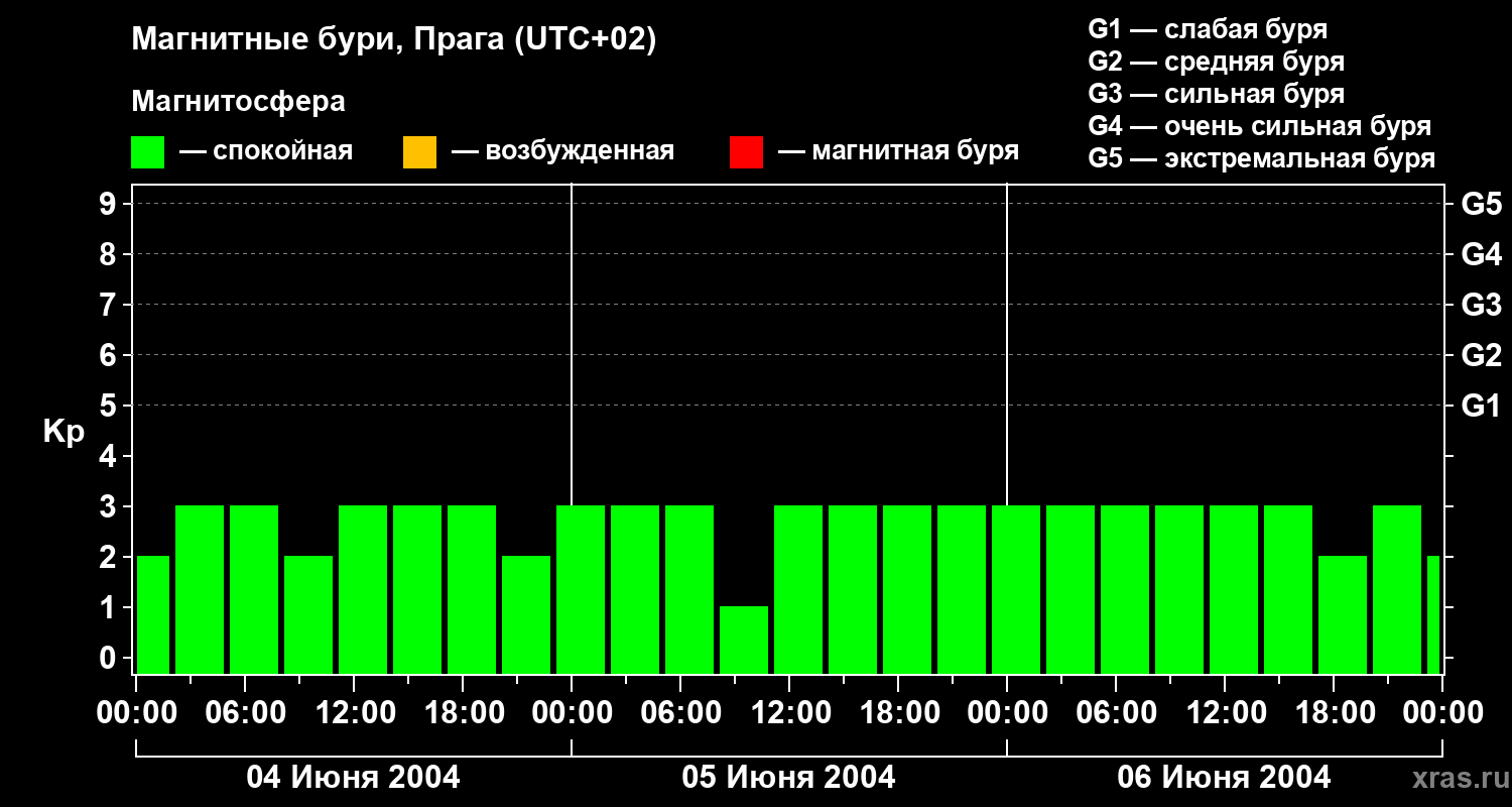 Изменения геомагнитного индекса Kp с 4 по 6 июня 2004 года для средних широт