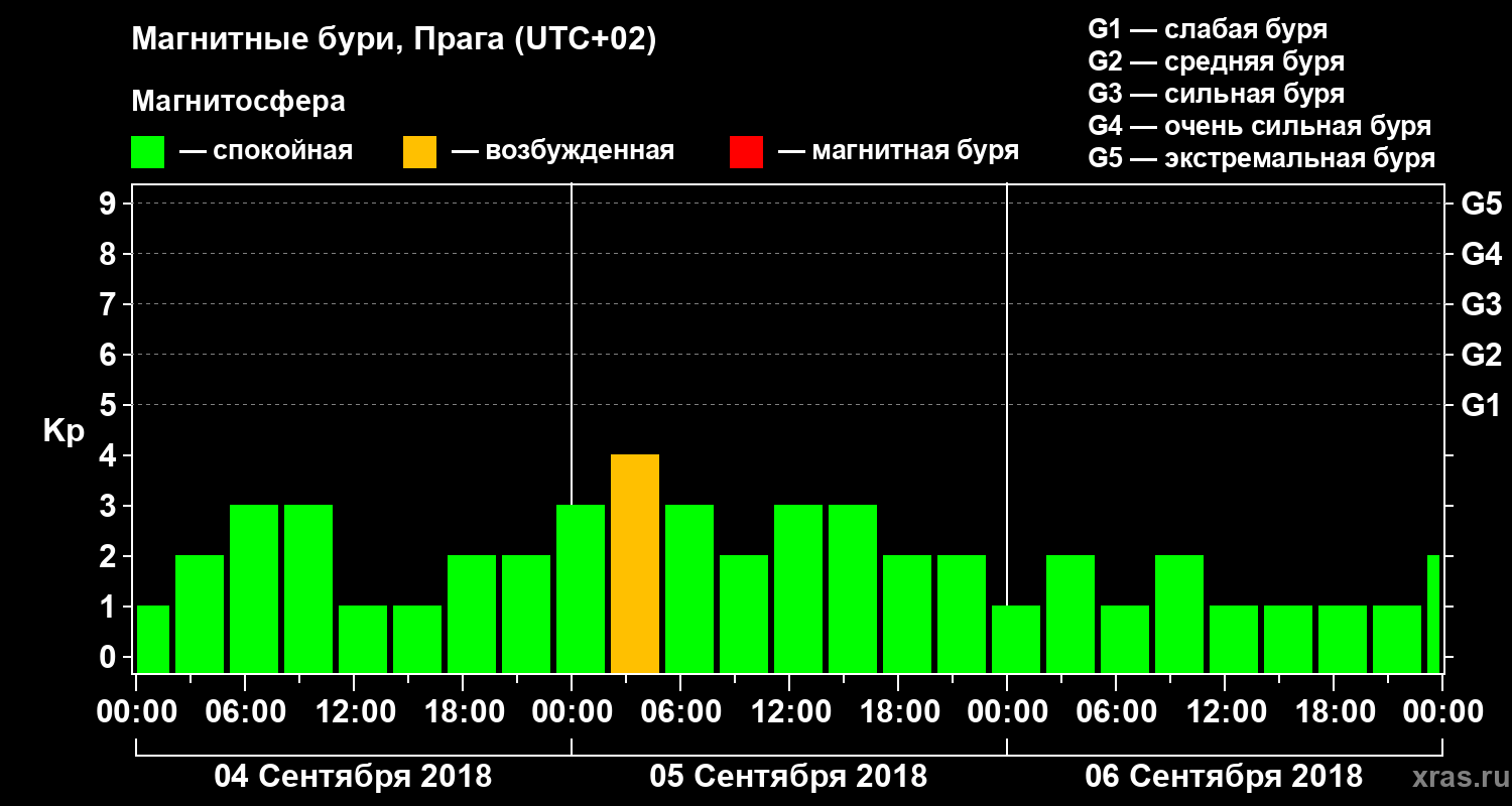 Изменения геомагнитного индекса Kp с 4 по 6 сентября 2018 года для средних широт