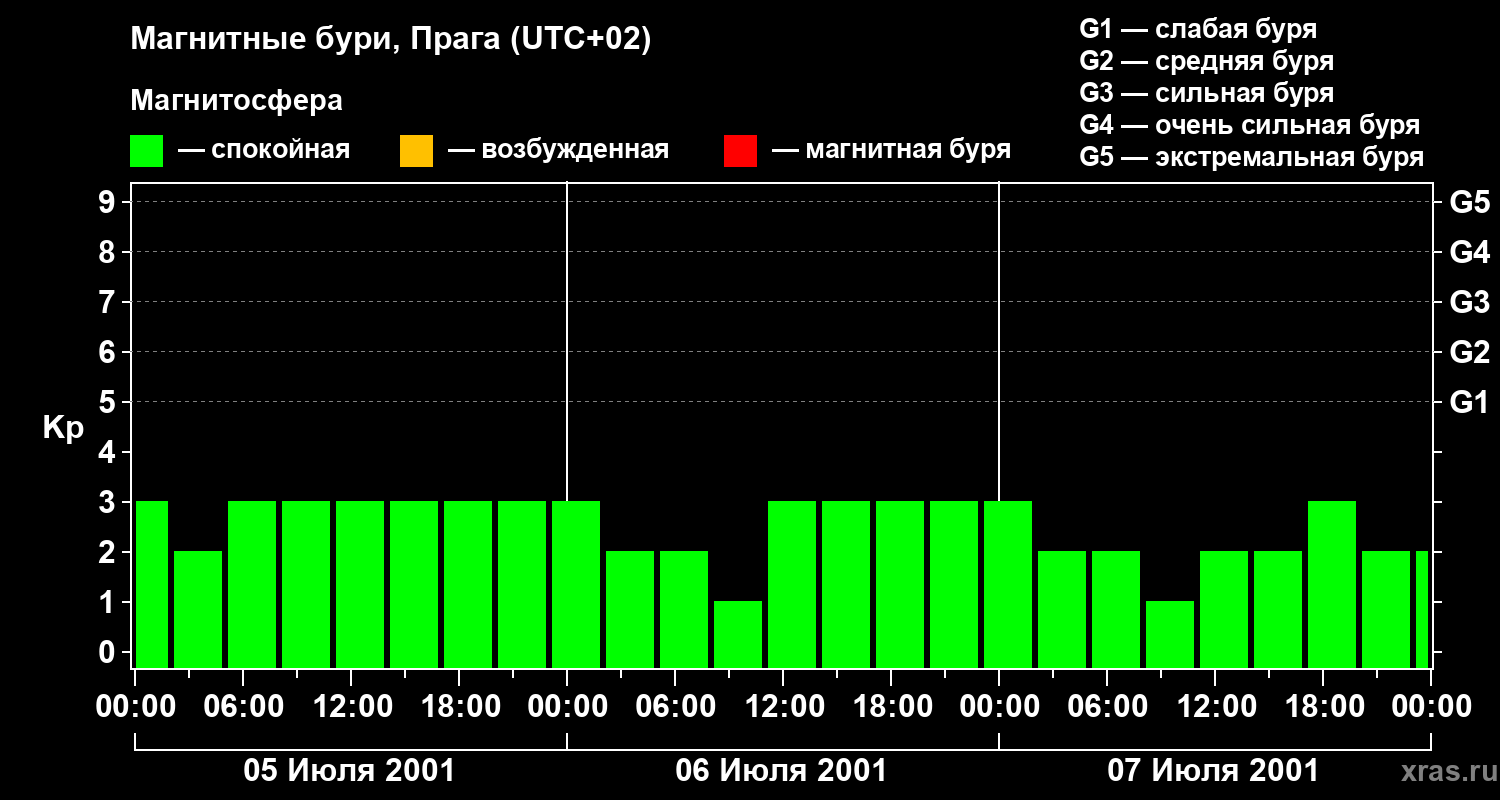 Изменения геомагнитного индекса Kp с 5 по 7 июля 2001 года для средних широт