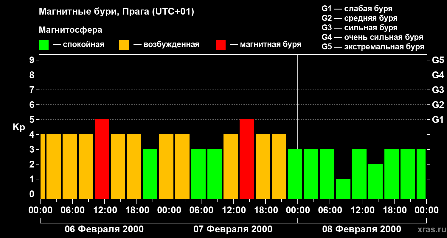 Изменения геомагнитного индекса Kp с 6 по 8 февраля 2000 года для средних широт