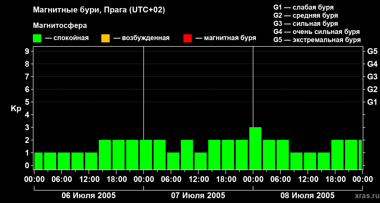 Изменения геомагнитного индекса Kp с 6 по 8 июля 2005 года для средних широт