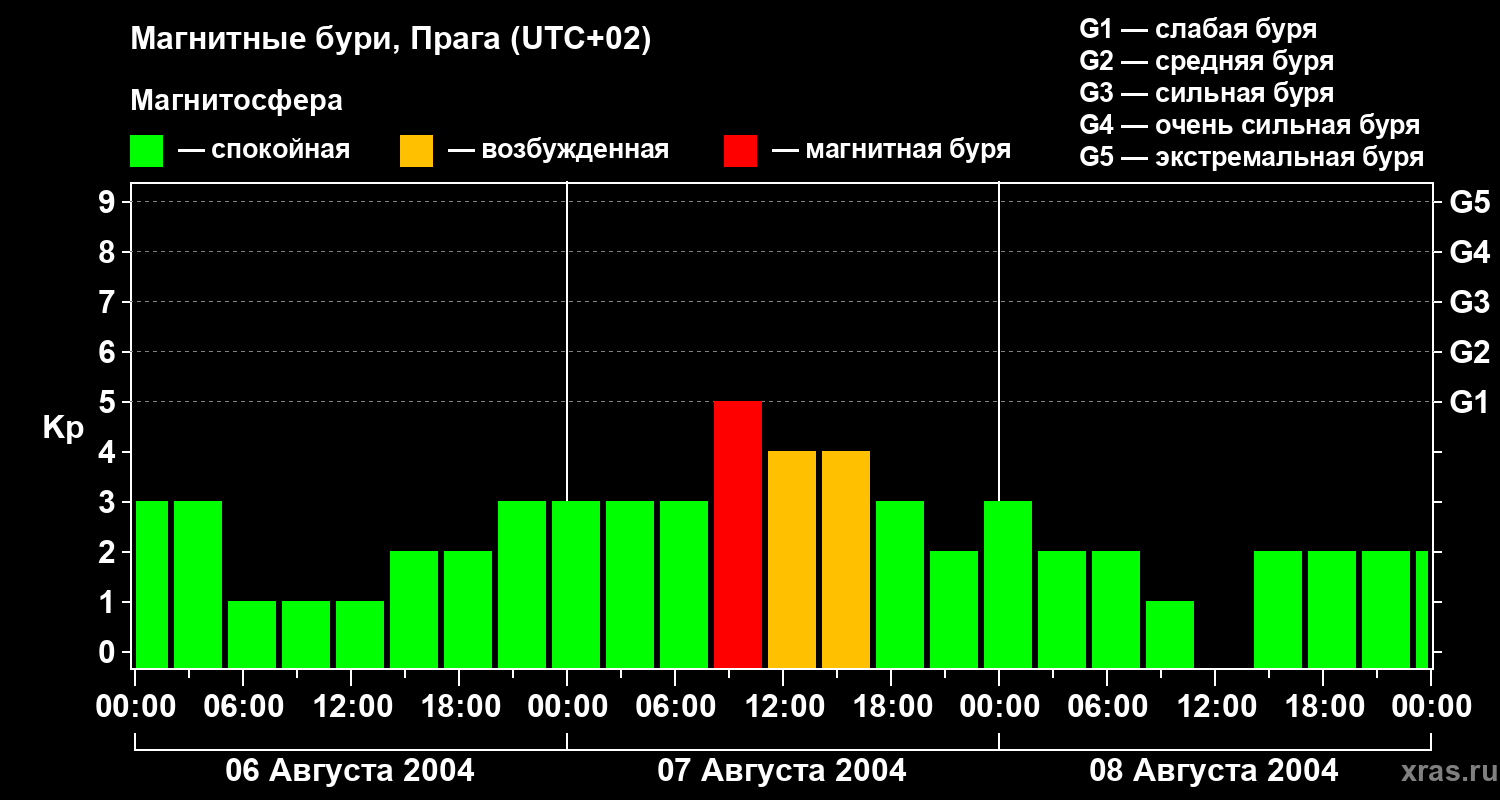 Изменения геомагнитного индекса Kp с 6 по 8 августа 2004 года для средних широт