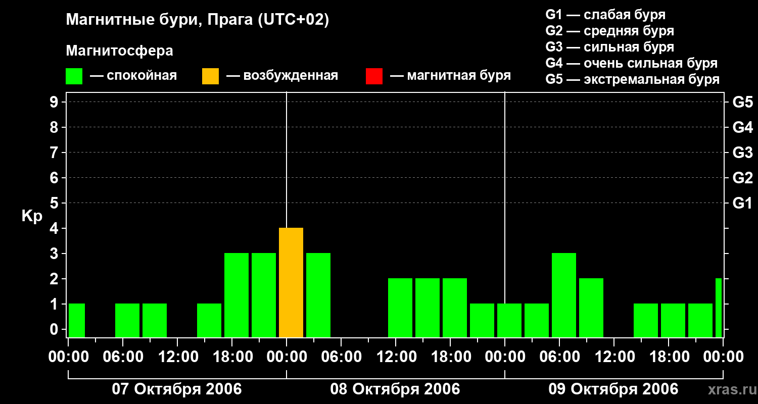 Изменения геомагнитного индекса Kp с 7 по 9 октября 2006 года для средних широт