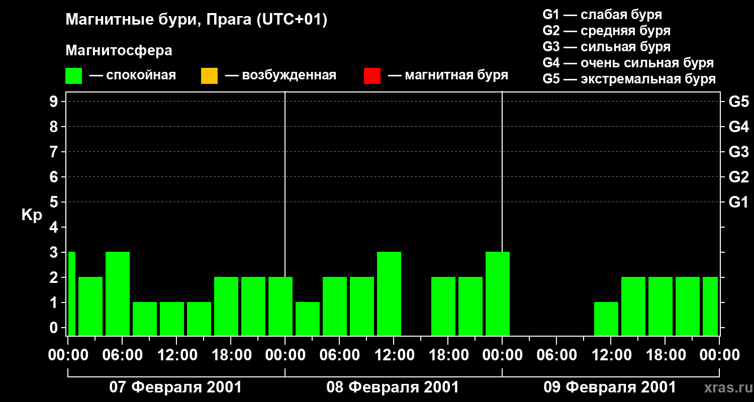 Изменения геомагнитного индекса Kp с 7 по 9 февраля 2001 года для средних широт