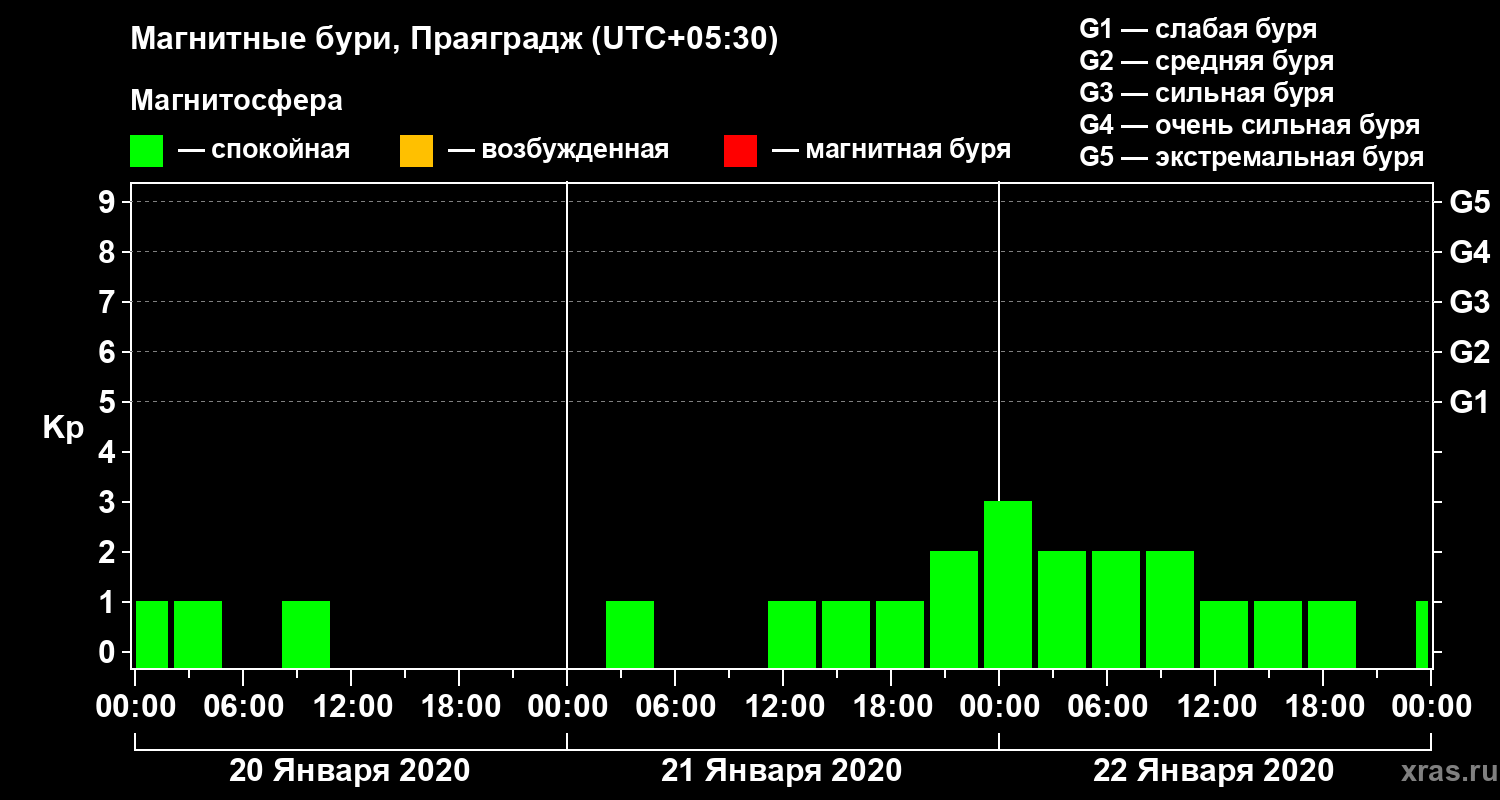 Изменения геомагнитного индекса Kp с 20 по 22 января 2020 года для средних широт