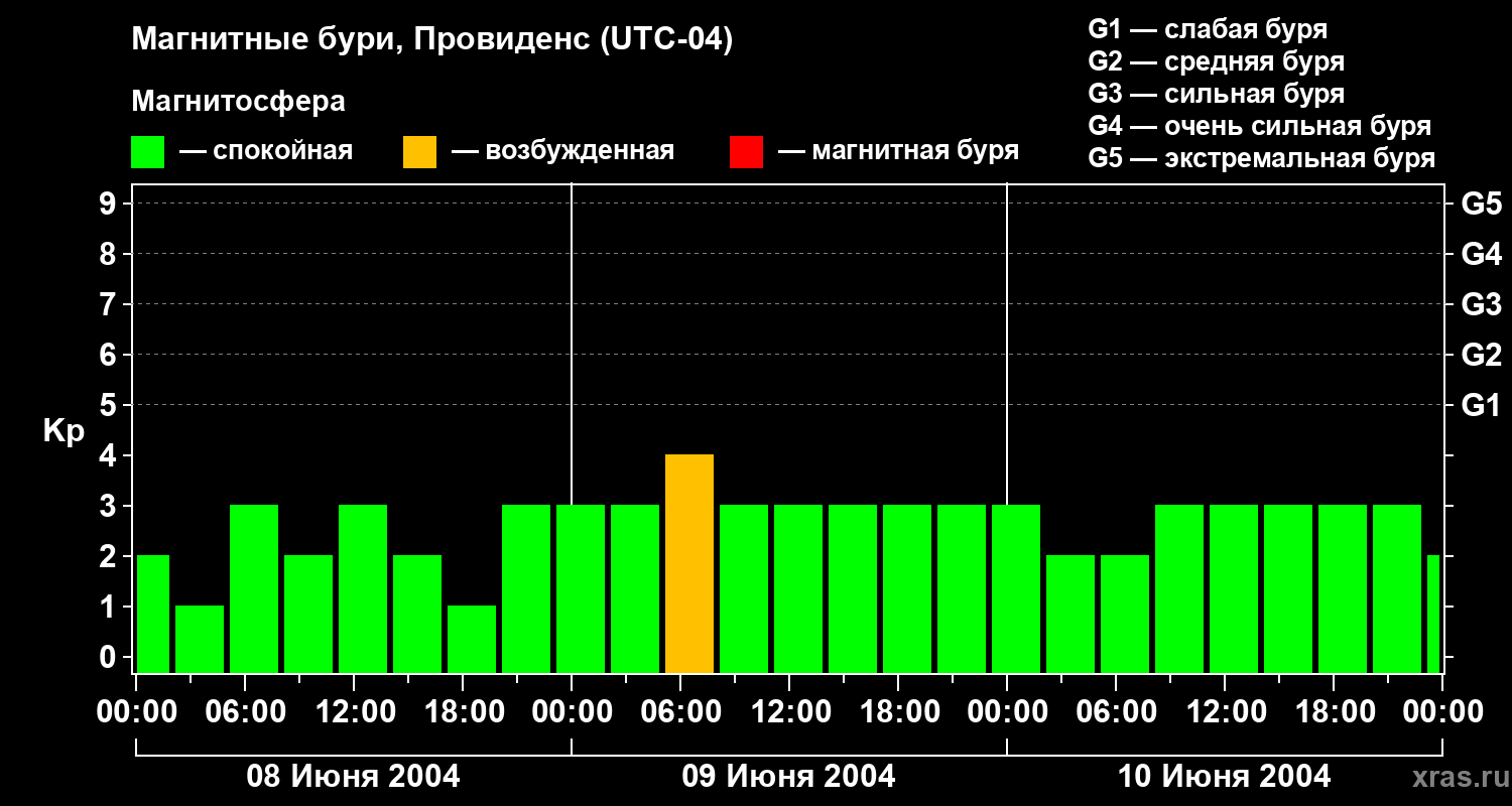 Изменения геомагнитного индекса Kp с 8 по 10 июня 2004 года для средних широт