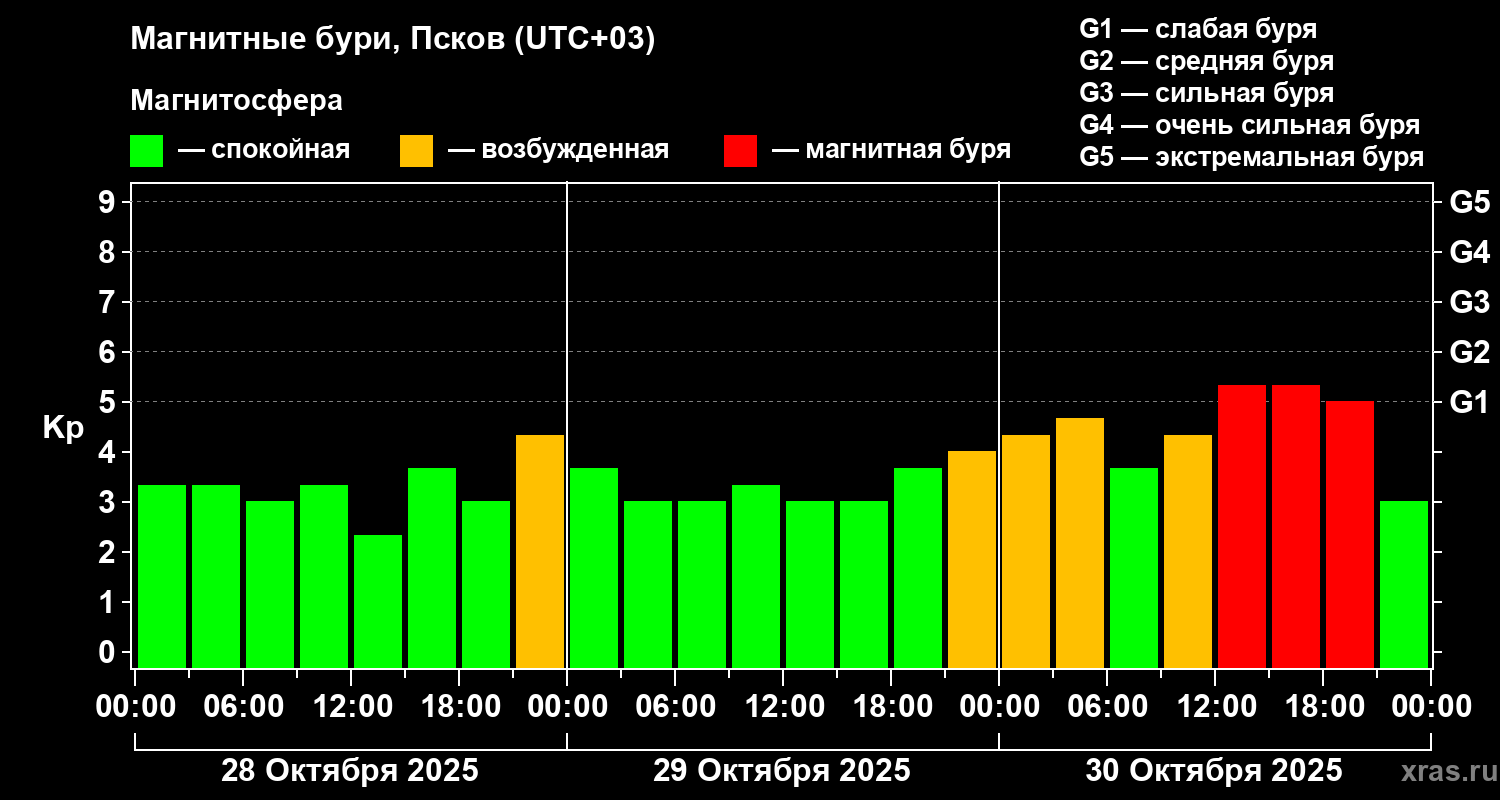 Изменения геомагнитного индекса Kp с 28 по 30 октября 2025 года для средних широт